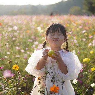 コスモス畑のまんなかで、みかん🍊💛