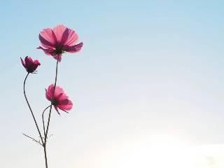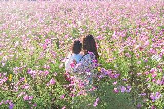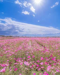 ピンクの花園、秋晴れの空