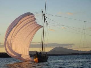 筑波山と夕日に染まる帆引き船