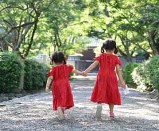 枝を拾う4歳と見守る兄姉。